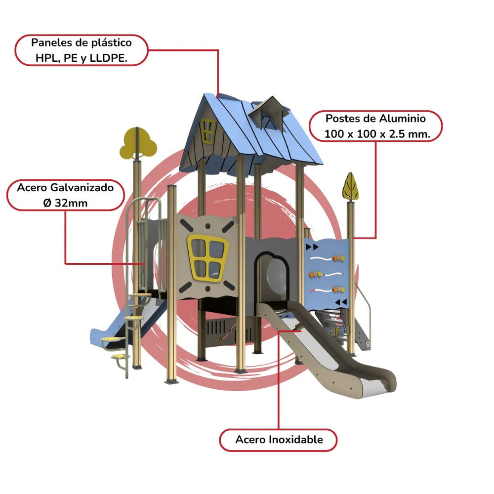 Fabricados en HPL de última generación. Únicos en el mercado. Equipados con postes de aluminio de alta calidad y con tobogán de acero inoxidable, sus adornos y componentes plásticos son de LLDPE y PE.